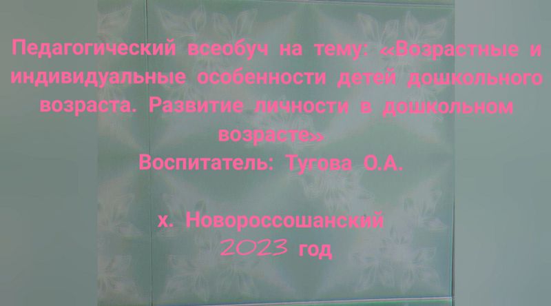 28 февраля по плану работы Отдела образования состоялся педагогический всеобуч в дошкольной группе на тему: «Возрастные и индивидуальные особенности детей дошкольного возраста. Развитие личности в дошкольном возрасте», который подготовил воспитатель Тугова О.А.